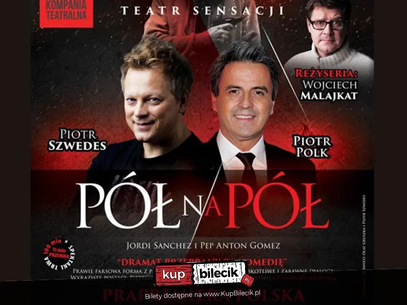 bilety: Czarna komedia w gwiazdorskiej obsadzie. Reżyser Wojciech Malajkat. "Pół na pół" to przesycona czarnym humorem komedia, opowiadająca o dwóch przyrodnich braciach, którzy postanawiają pozbyć się swojej rodzicielki. Czy można polubić kogoś, kto źle życzy własnej matce? Okazuje się, że i owszem. Robert i Dominik, którzy na początku jawią nam się jako dwa niezbyt sympatyczne typy (jeden chce uciec, bo ma dość opiekowania się na wpół sparaliżowaną staruszką, drugiemu najbardziej zależy na pieniądzach ze spadku), powoli odkrywają coraz mroczniejsze tajemnice, które pokazują, jakim potworem była i jest ich własna matka. Nestorka rodu nie pojawia się na scenie, jej obecność sygnalizuje tylko natarczywy dzwonek, a mimo to mamy świadomość, że nadal jest wszechobecna i wciąż tyranizuje otoczenie, a na dodatek jest "niezatapialna" jak nie przymierzając pani Wilberforce z "Trzeba zabić starszą panią". Pół na pół artyści: Wojciech Malajkat, Piotr Polk, Piotr SzwedesDwaj przyrodni bracia, Robert i Dominik, zupełnie serio rozważają ten dylemat. Realizacja ich życiowych planów i marzeń stoi pod znakiem zapytania, dopóki... żyje ich matka. Wbrew pozorom bracia nie są wcale bezduszni potworami czyhającymi na śmierć biednej matki staruszki. Rzeczywistość przedstawiona we współczesnej hiszpańskiej komedii jest o wiele bardziej skomplikowana a historia relacji łączącej braci z matką jest opowiedziana w sposób przewrotny i bardzo...śmieszny. Obok śmiechu sąsiadują też: napięcie i groza, godne mistrza gatunku - Alfreda Hitchocka. Bilety do nabycia na: KupBilecik.pl |
